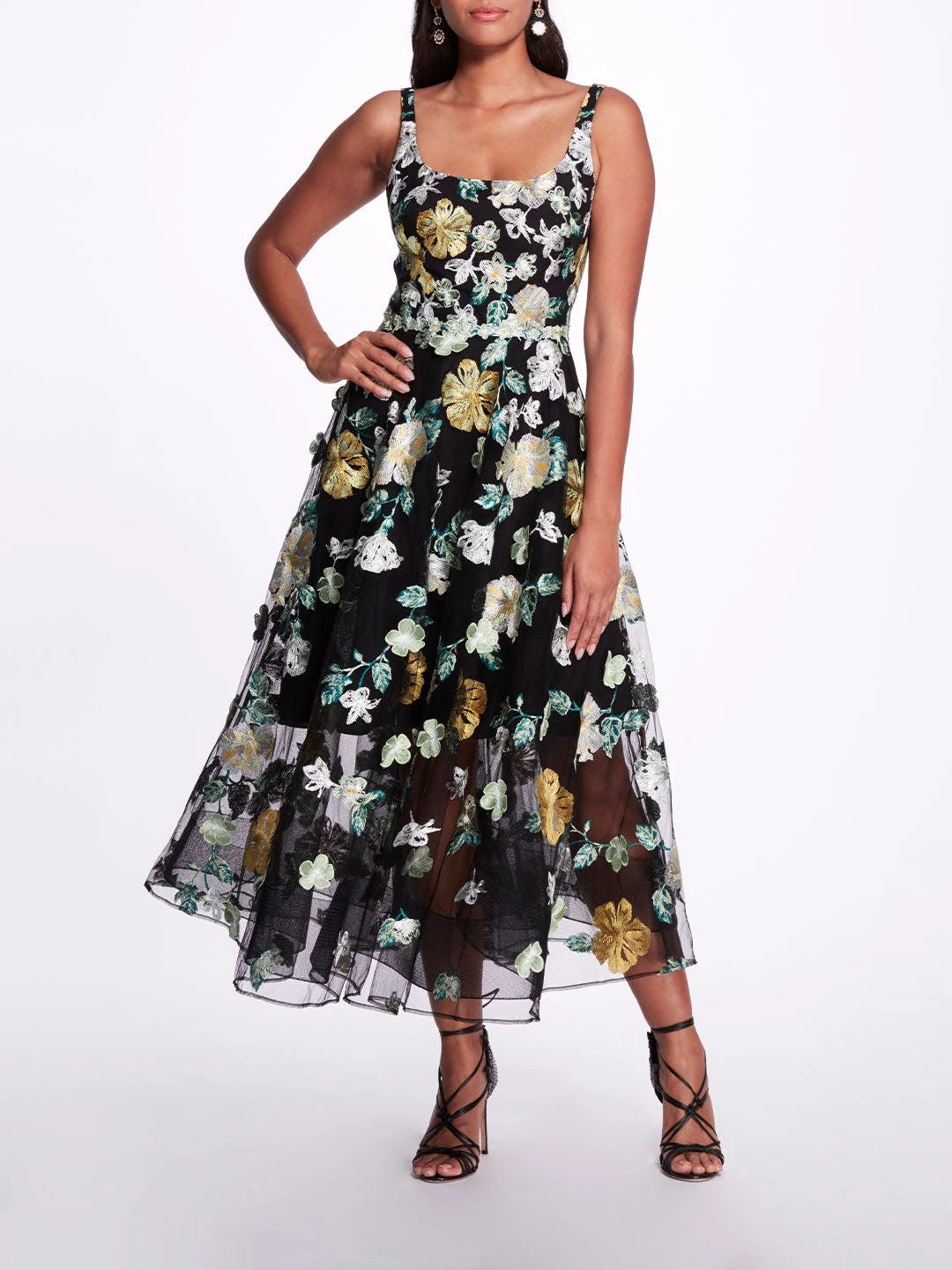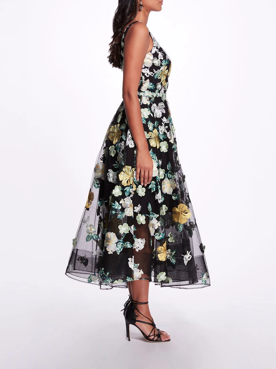 The appeal of sophistication, This Tea-Length Gown in Black features a sleeveless u-neckline, an a-line silhouette, an embroidered tulle and a floral detailed belt.
