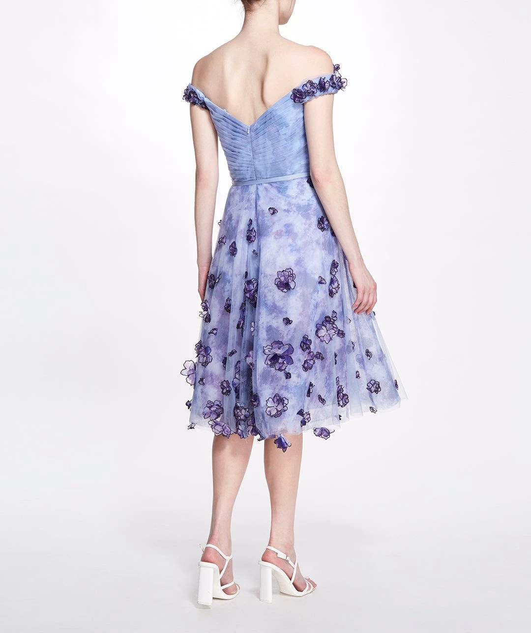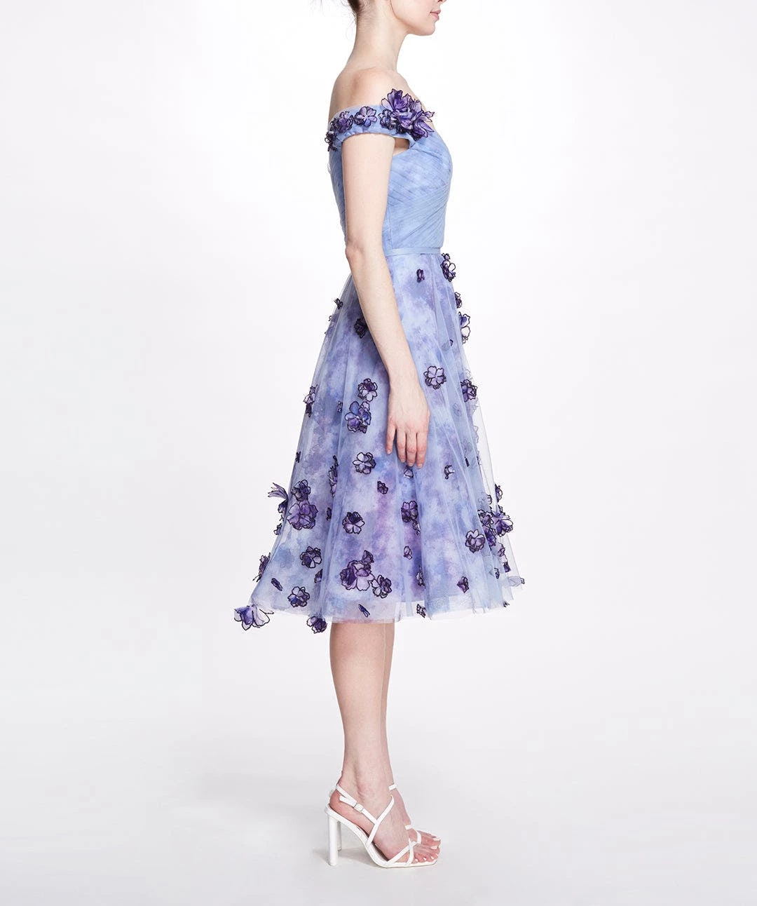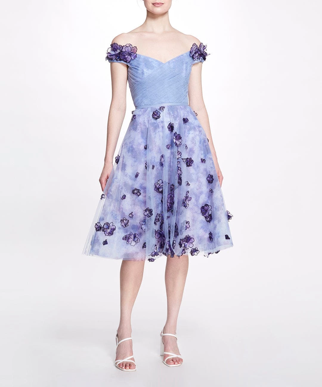 The embodiment of enchanting florals, The Floral Sweetheart Cocktail Dress in Dusty Blue features an a-line silhouette, off the shoulder sweetheart neckline, draped bodice, and ombre 3 d flowers to create a romantic look. Flowing in watercolor florals, it’s the perfect addition to any glamorous wardrobe.