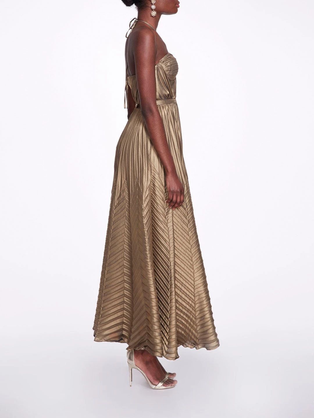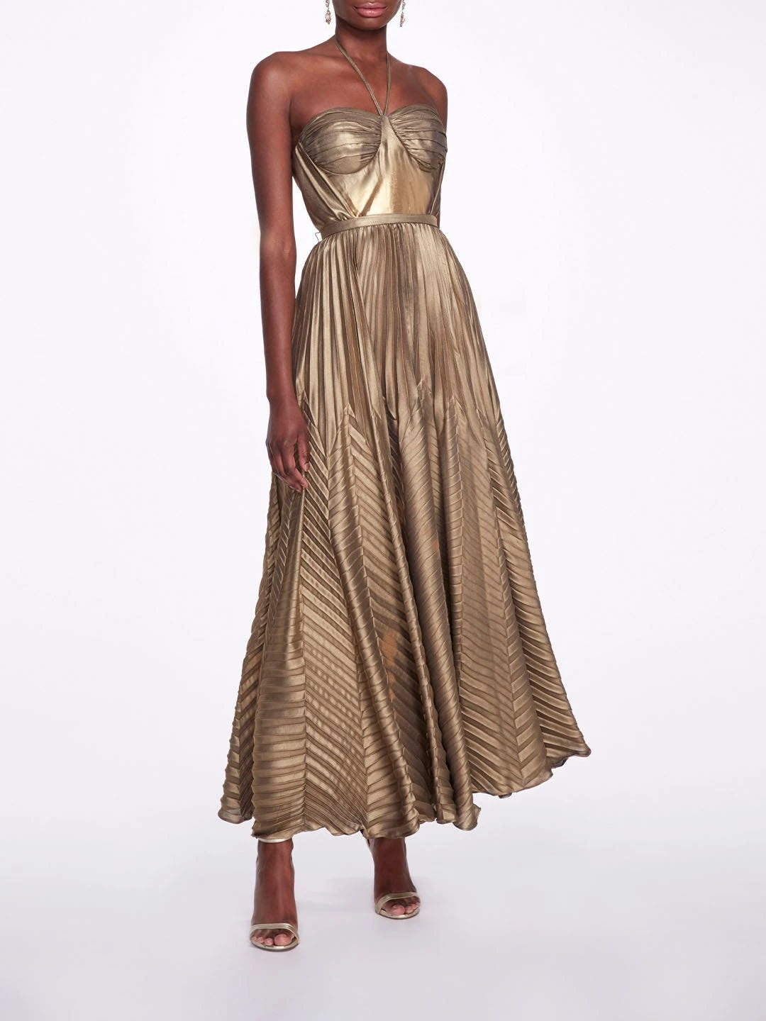 The personification of elegance, this tea-length dress in gold features a halter neckline, foiled georgette fabric, with a pleated bodice and chevron pleated skirt.