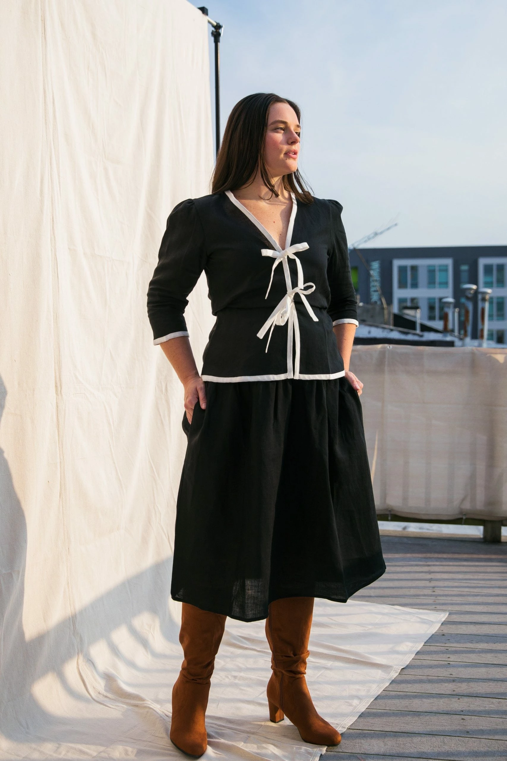 Beth is a midi-length skirt with a bias-cut yoke made of 100% linen. She has pockets (yes!), a flat front waistband, and an elastic waistband in the back for a dependably flattering fit. Just slip her over your head.Beth loves snuggling up with books, puppies, tea, and toasty socks just as much as she loves rooftop soirees at sunset.SIZE XS to fit: Waist 25-27in / Length 27inSIZE S to fit: Waist 26-28in / Length 28inSIZE M to fit: Waist 28-30in / Length 29inSIZE L to fit: Waist 30-32in / Length 30inSIZE XL to fit: Waist 32-34in / Length 31in