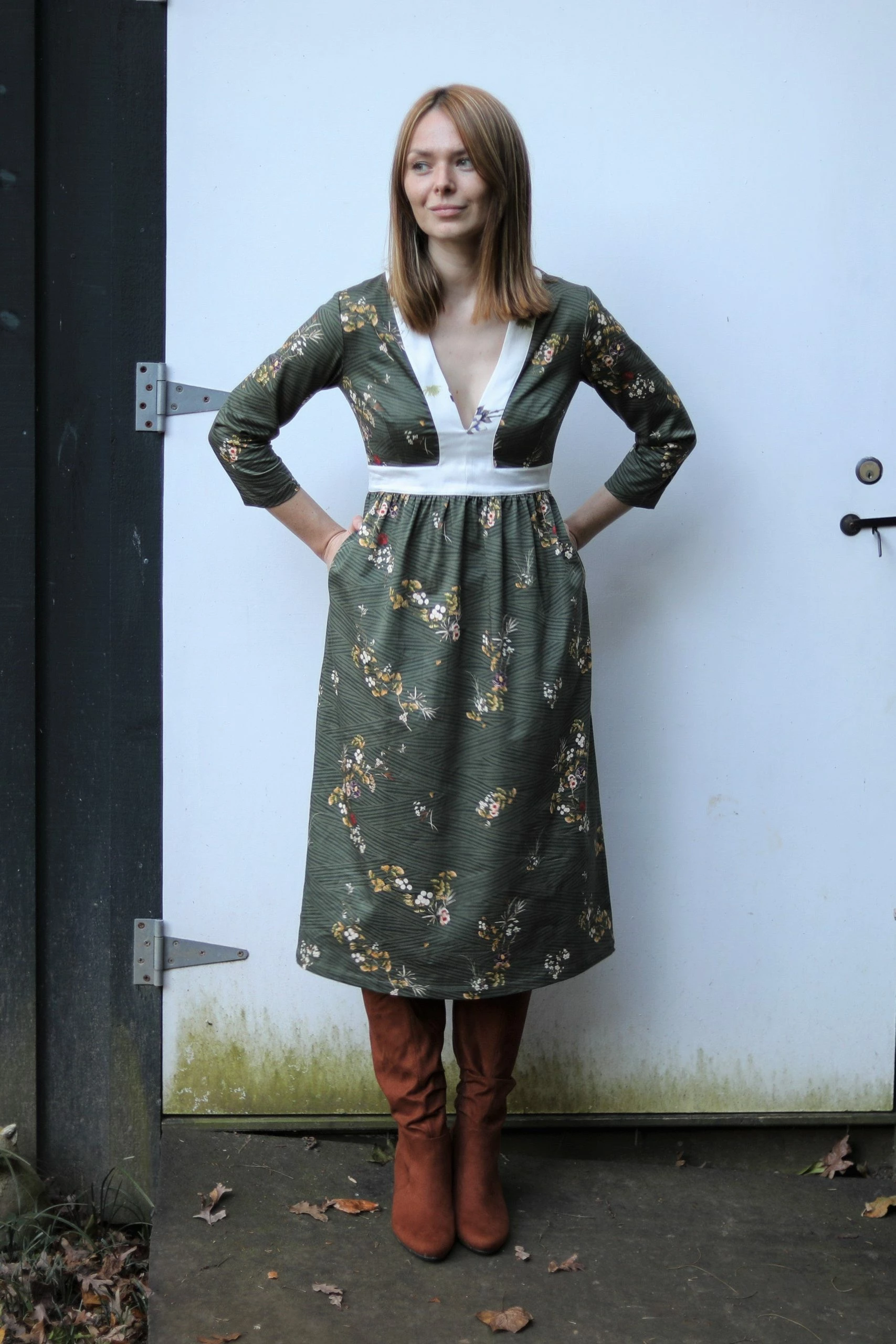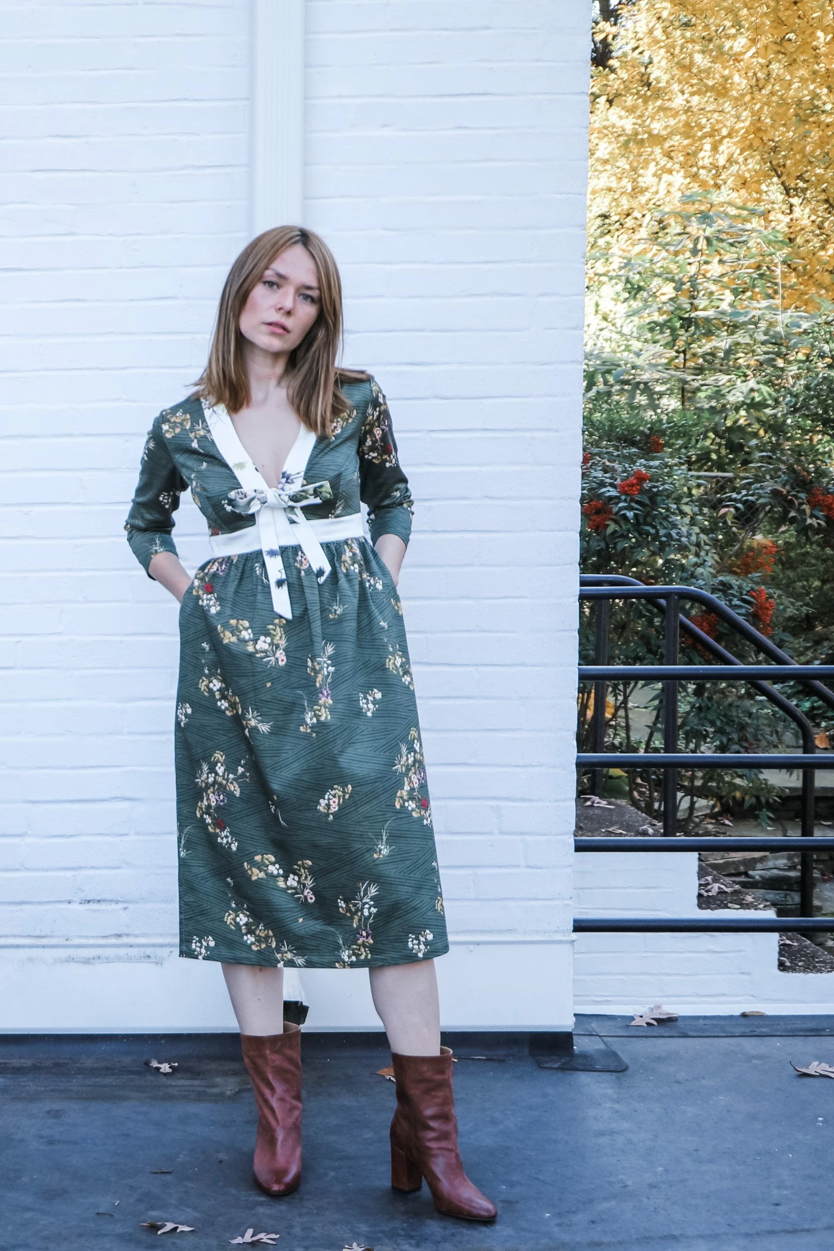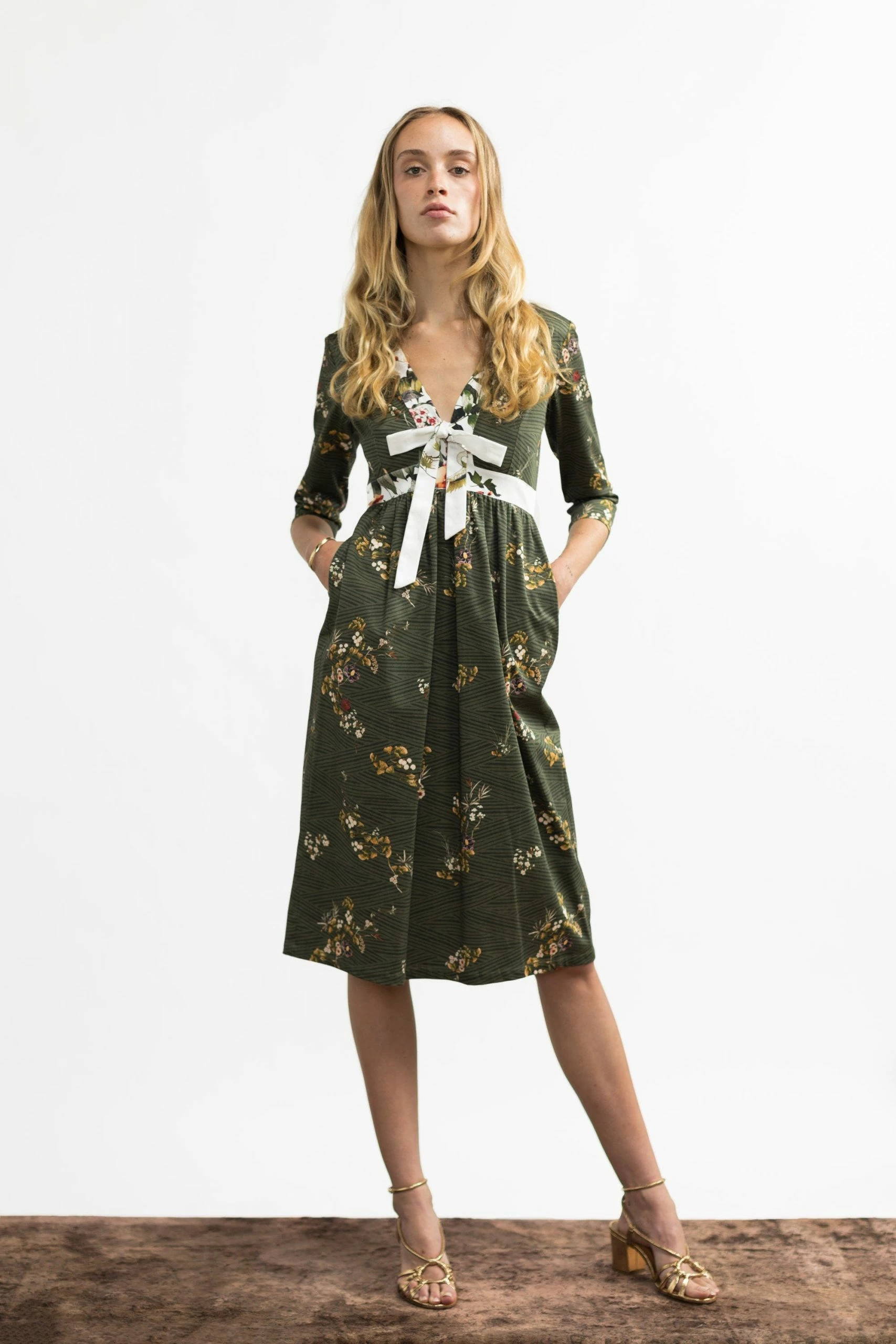 Carla is a midi dress with a low (but still discreet) V-neck and detachable bow (the bow is the perfect length to be worn as a headband). She loves choices! She has a fitted bodice, gathered skirt, and deep pockets. She’s modern with a vintage vibe.Machine Wash / Machine Dry (but wouldn’t it look beautiful on a clothesline, swaying in the breeze?)Fits true to size. SIZE XS to fit: Chest 33in / Waist 27in SIZE S to fit: Chest 35in / Waist 29in SIZE M to fit: Chest 36in / Waist 30.5in SIZE L to fit: Chest 38in / Waist 32in SIZE XL to fit: Chest 40in / Waist 34in