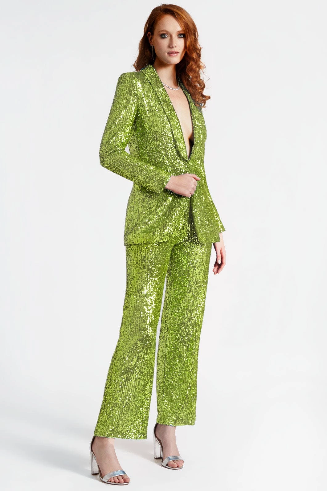 You’ve been the center of attention this whole time. The Starling is here to make that even more obvious. These sequin bottoms come in lime and should be sized down for a more snug fit. All you need are some silver pumps and The Starling blazer to match. Can it be cocktail hour already?Pair The Starling Lime Sequin Pant with the starling lime sequin blazer for a matching suiting set.