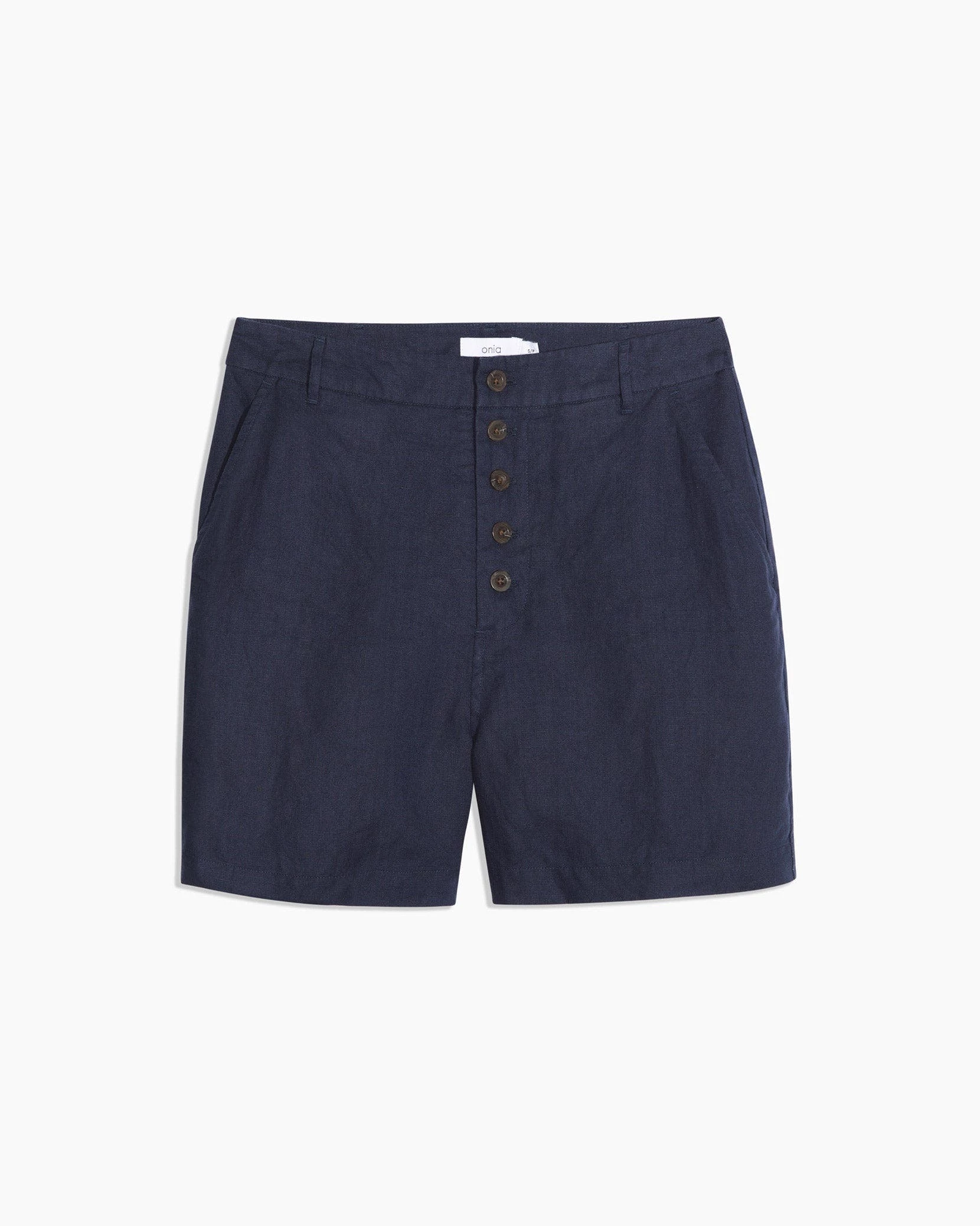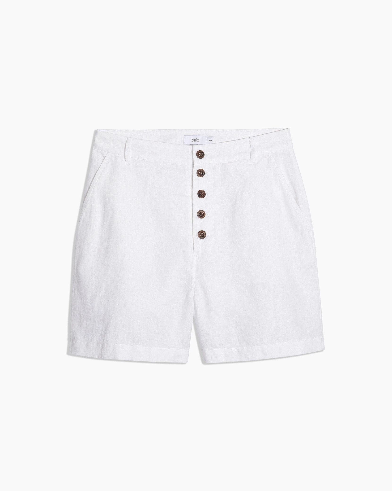Onia’s high-waisted linen boyfriend short is designed to be styled any number of ways — in a set opposite the matching button-down, with swimwear or everyday basics. The pair offers a loose fit with crisply tailored finishes including belt loops, an exposed button fly and slit pockets.
