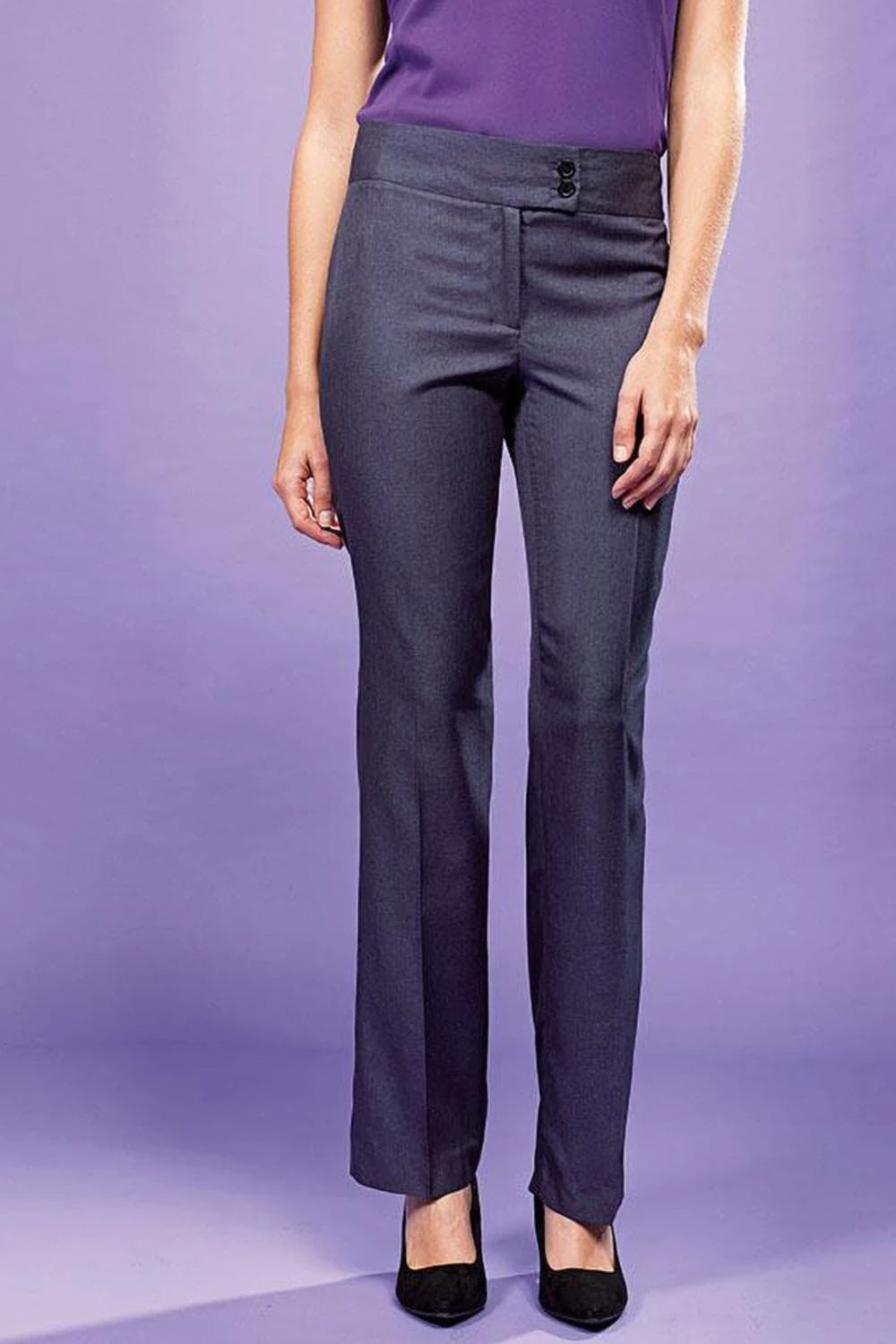 A straight leg trouser for women that features a deep waistband with crossover tab and with two button fastening. Available in two leg lengths, this is great all round uniform trouser.