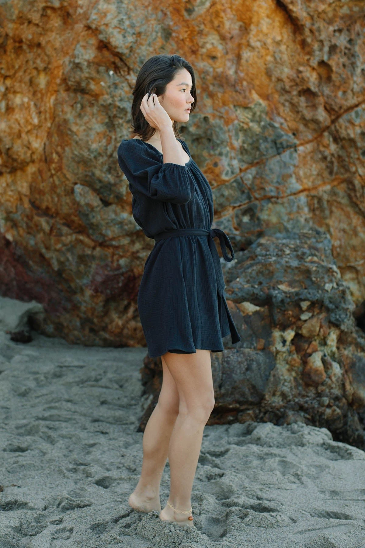 The Alba dress is made in the cotton gauze fabric. It features a square neckline, full feminine sleeves, a short skirt and a detachable self belt. Wear it loose or belt it for a waist-cinching look. Dress it up with a heel or down with a sandal, this dress has just the right amount of coverage for a summer evening or a warm day.