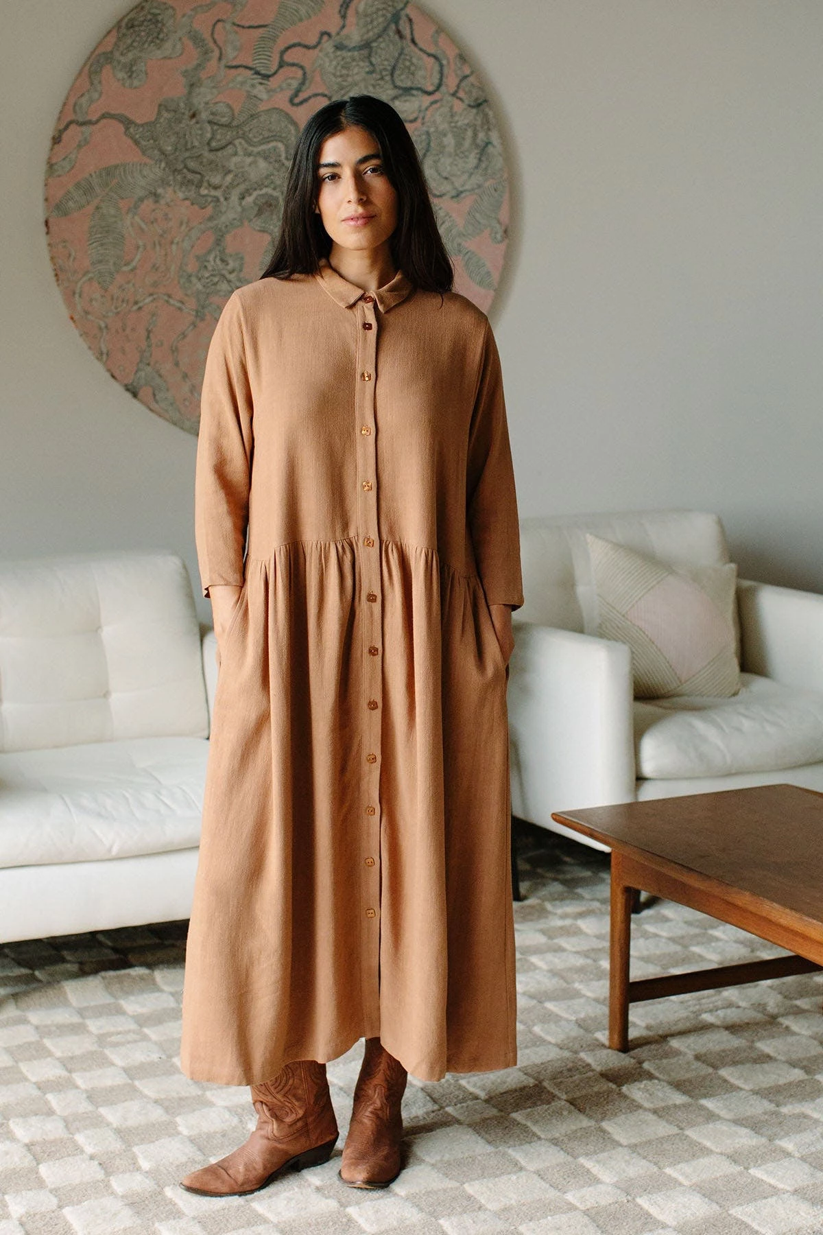 The leo dress is an oversized shirt-dress. This dress is equally chic with sandals or with loafers! They will wear it for cooler summer evenings and plan to bring it into fall with boots and leggings and a chunky cardigan. It is simple and classic.