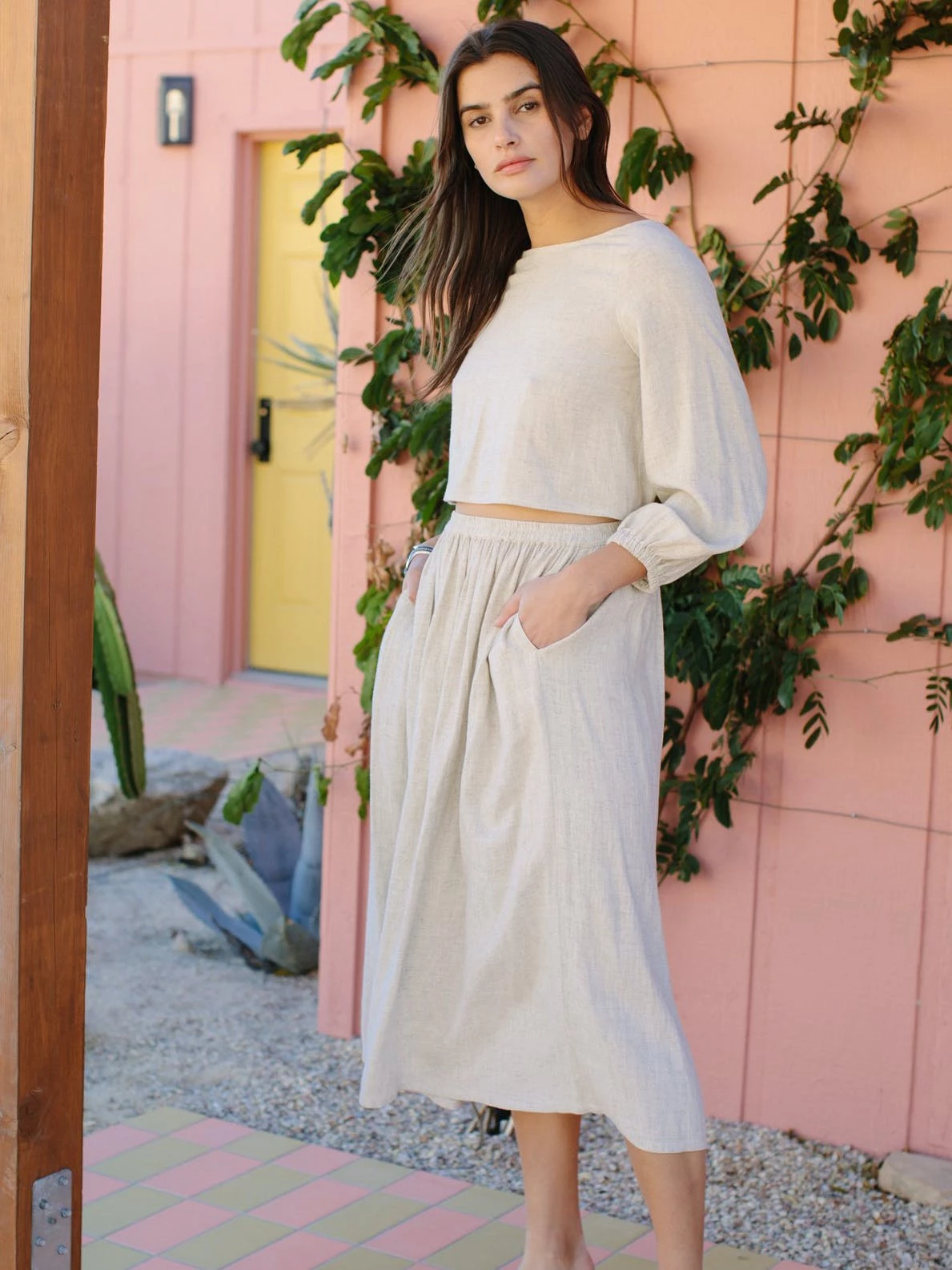 The Olivia skirt in our linen/rayon blend is an easy pull on skirt and features an elastic waistband and pockets. Pairs perfectly with the matching ava or freya tops, or your favorite white tee. wear this skirt everyday! Boots, sandals, sneakers…anything goes!