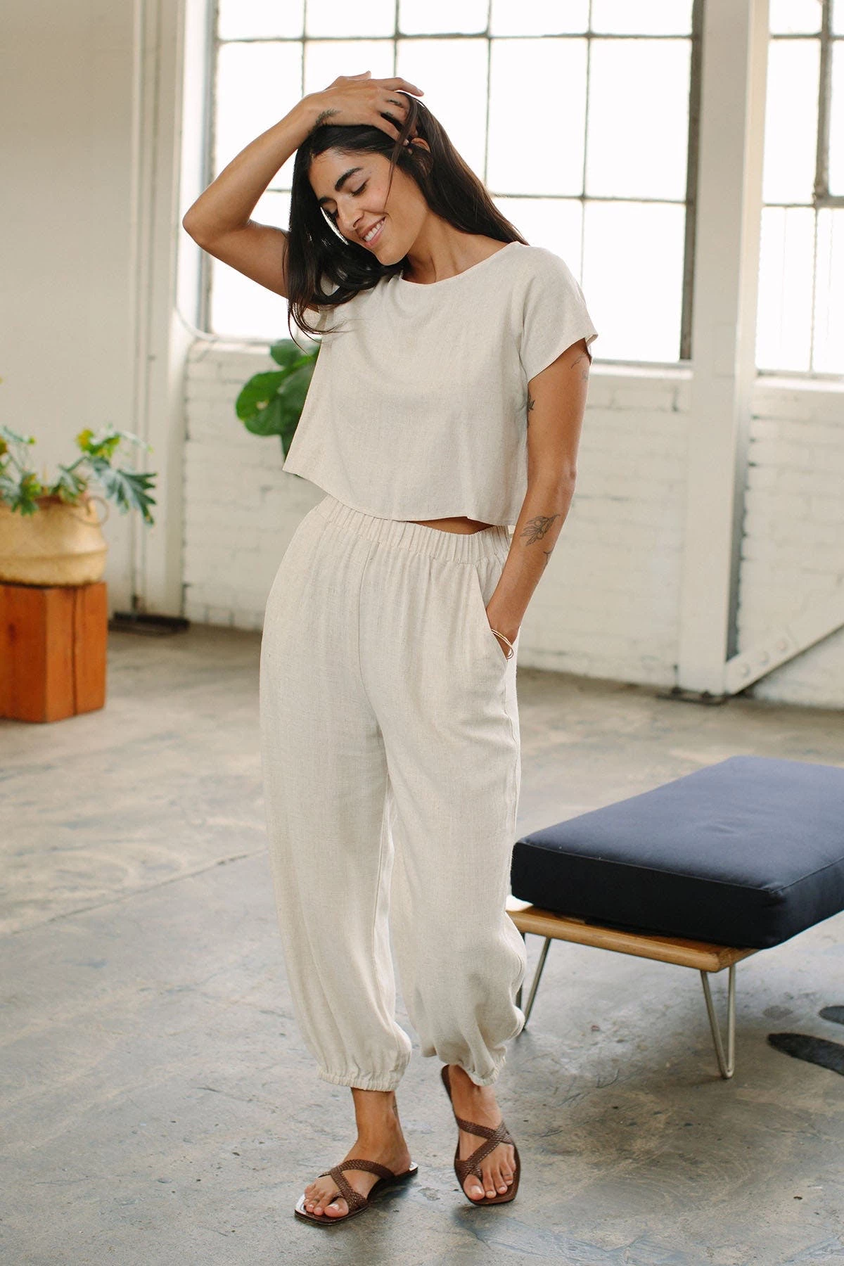 The Linen Tatum Pant features a high waist, side pockets, and a gathered ankle. These pants can be worn anywhere and everywhere! They are especially perfect when paired with their matching keith top!