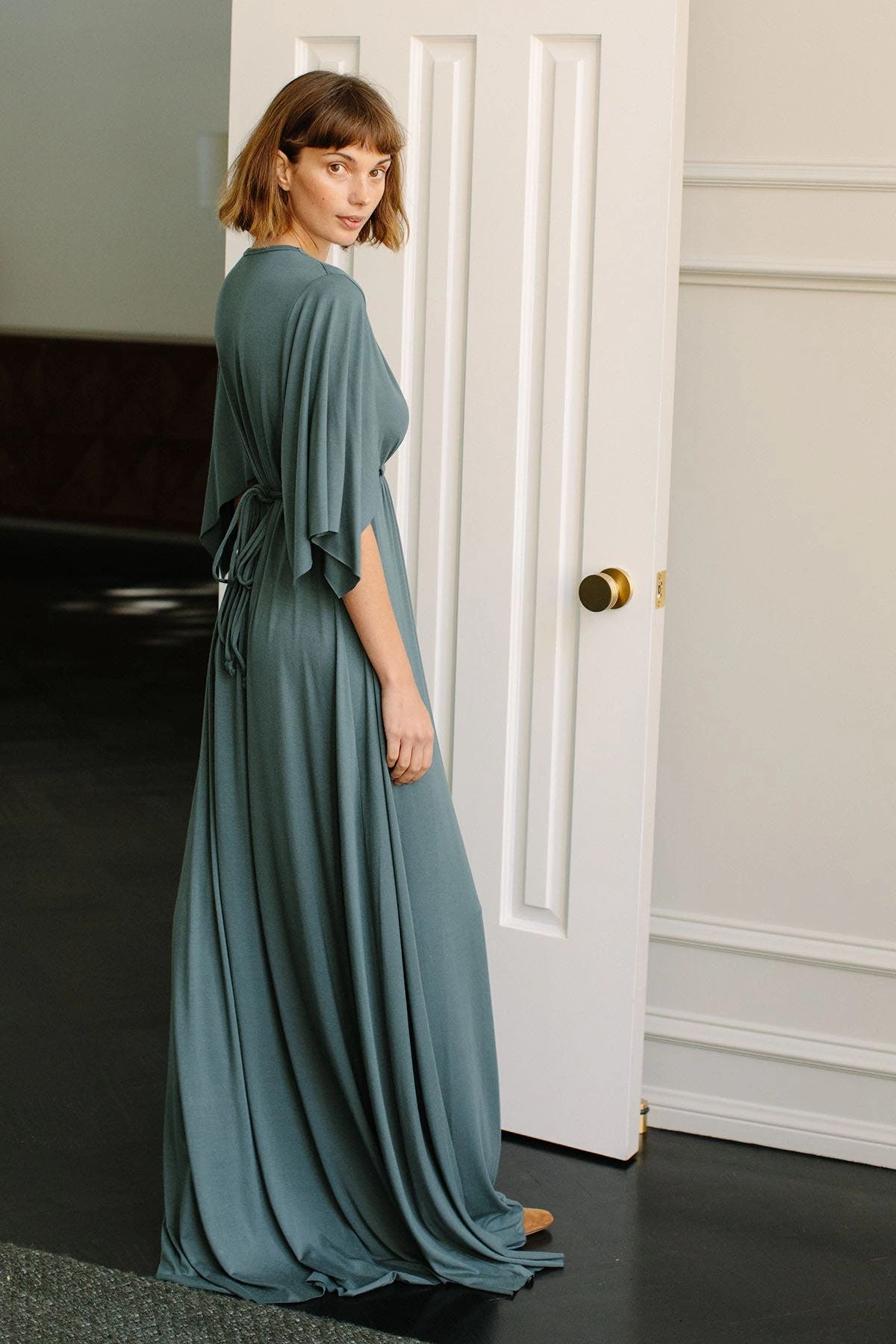 This best-selling long caftan dress flatters all figures, with extra volume that creates drama and flowing movement. Intentional raw hem for easy alterations- no sewing necessary.
