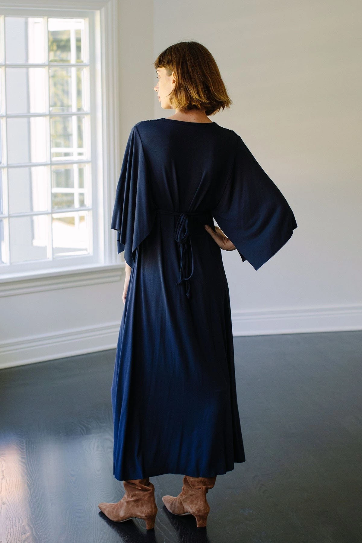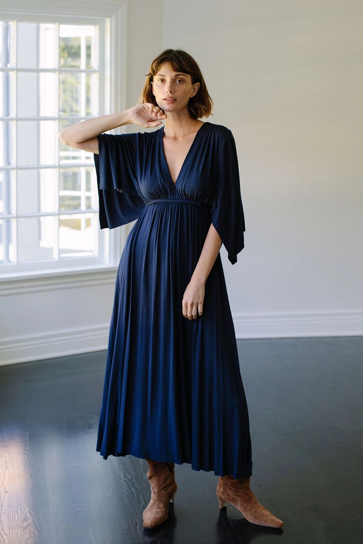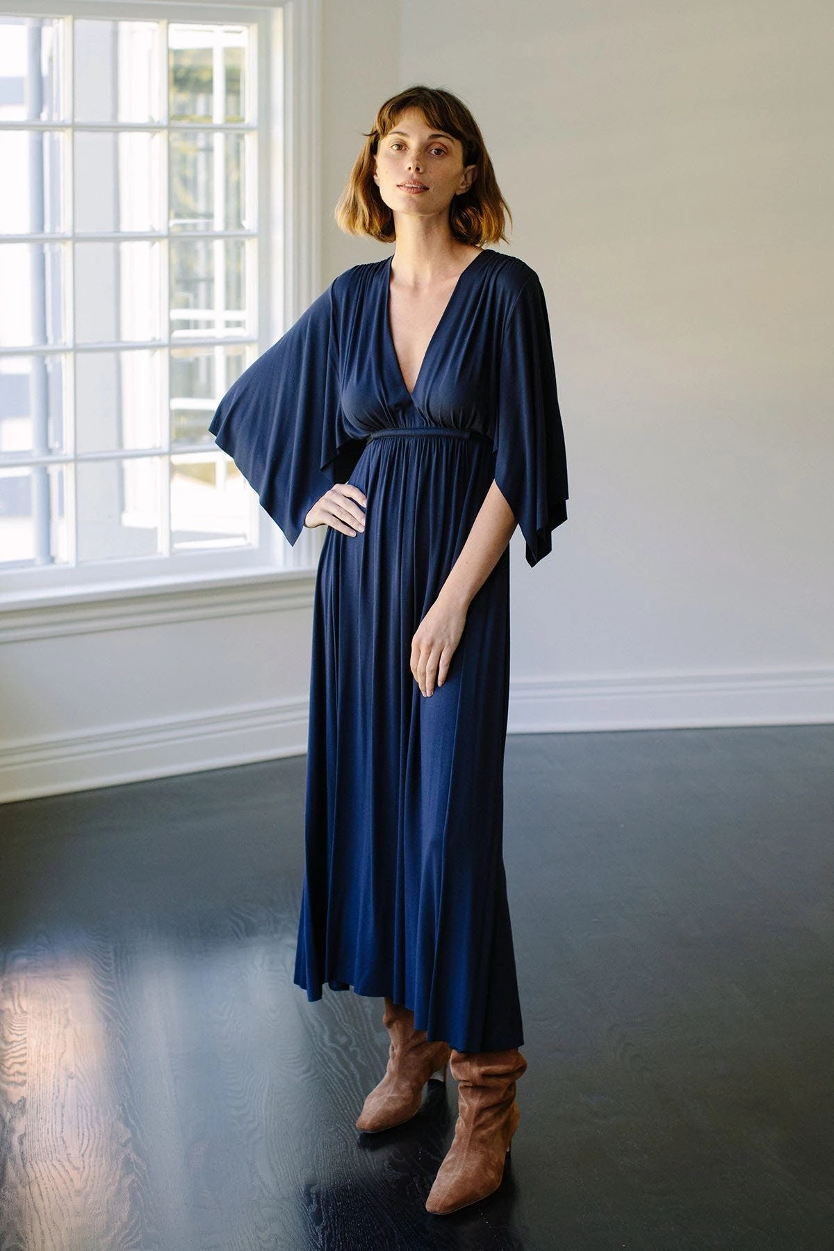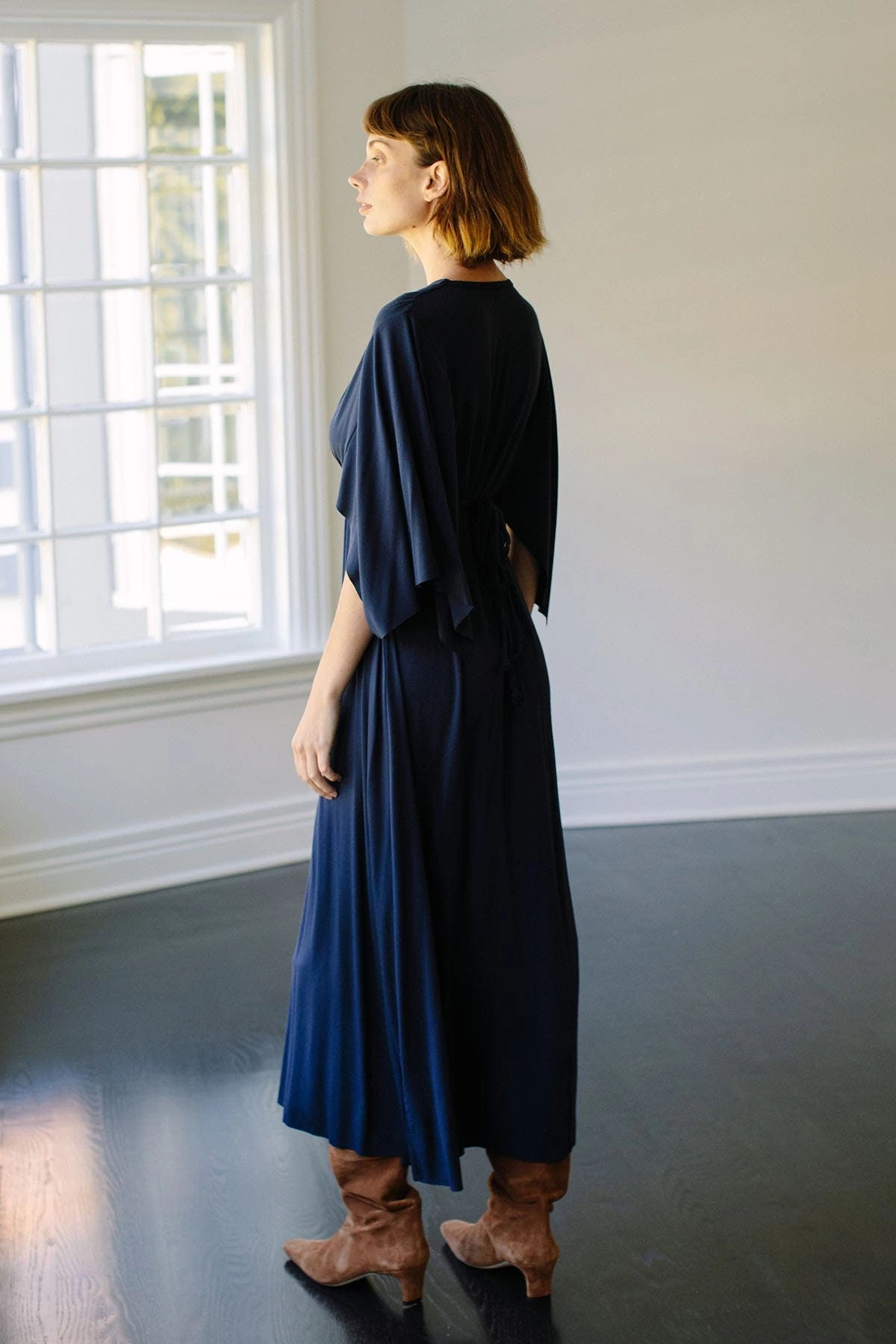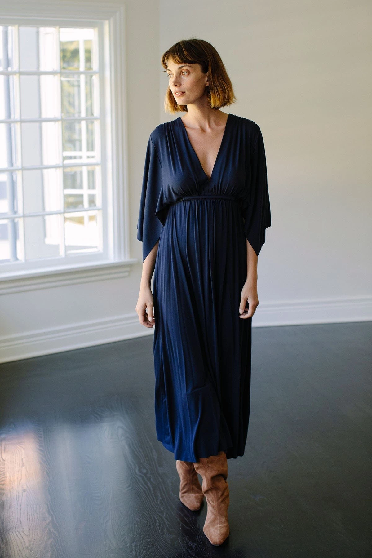 Updated in the holiday shade of blueprint, this best-selling Mid-Length Caftan Dress flatters all figures, with extra volume that creates drama and flowing movement.