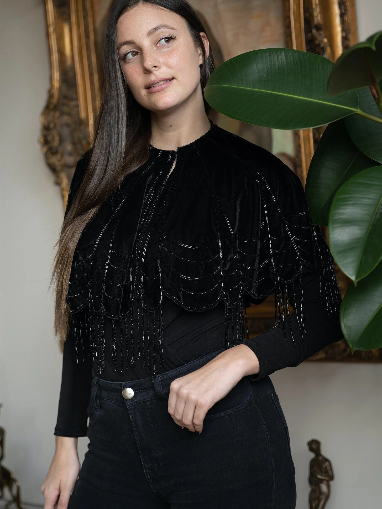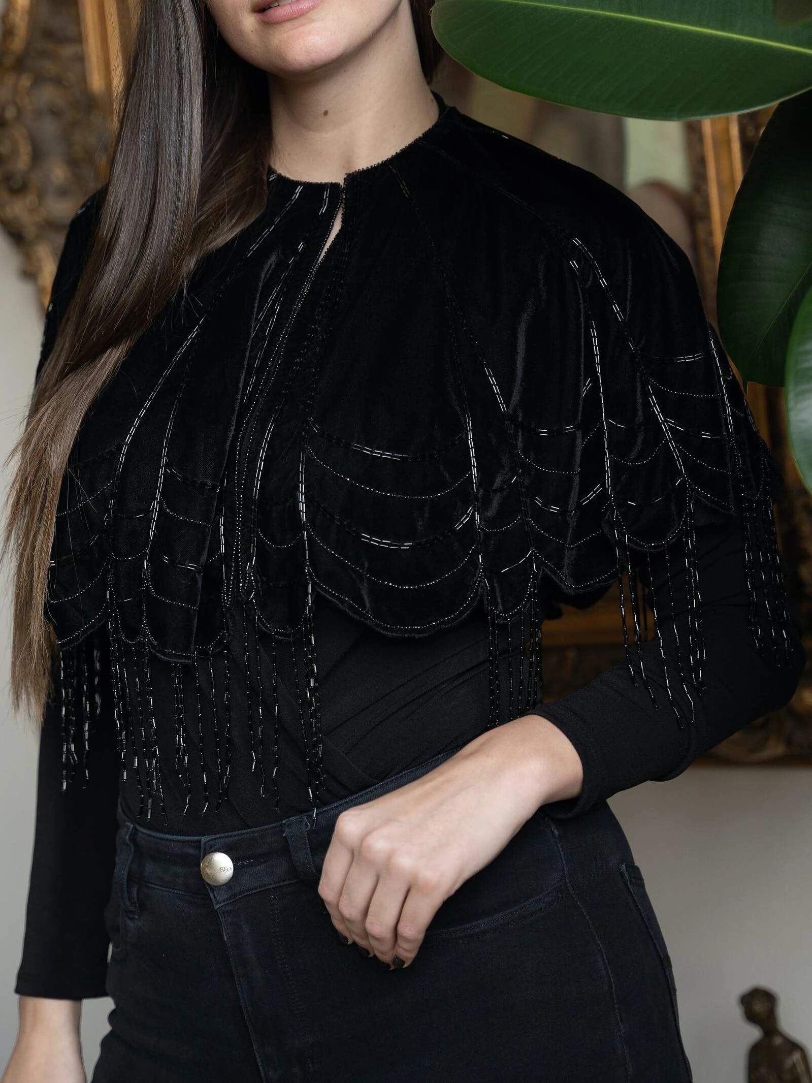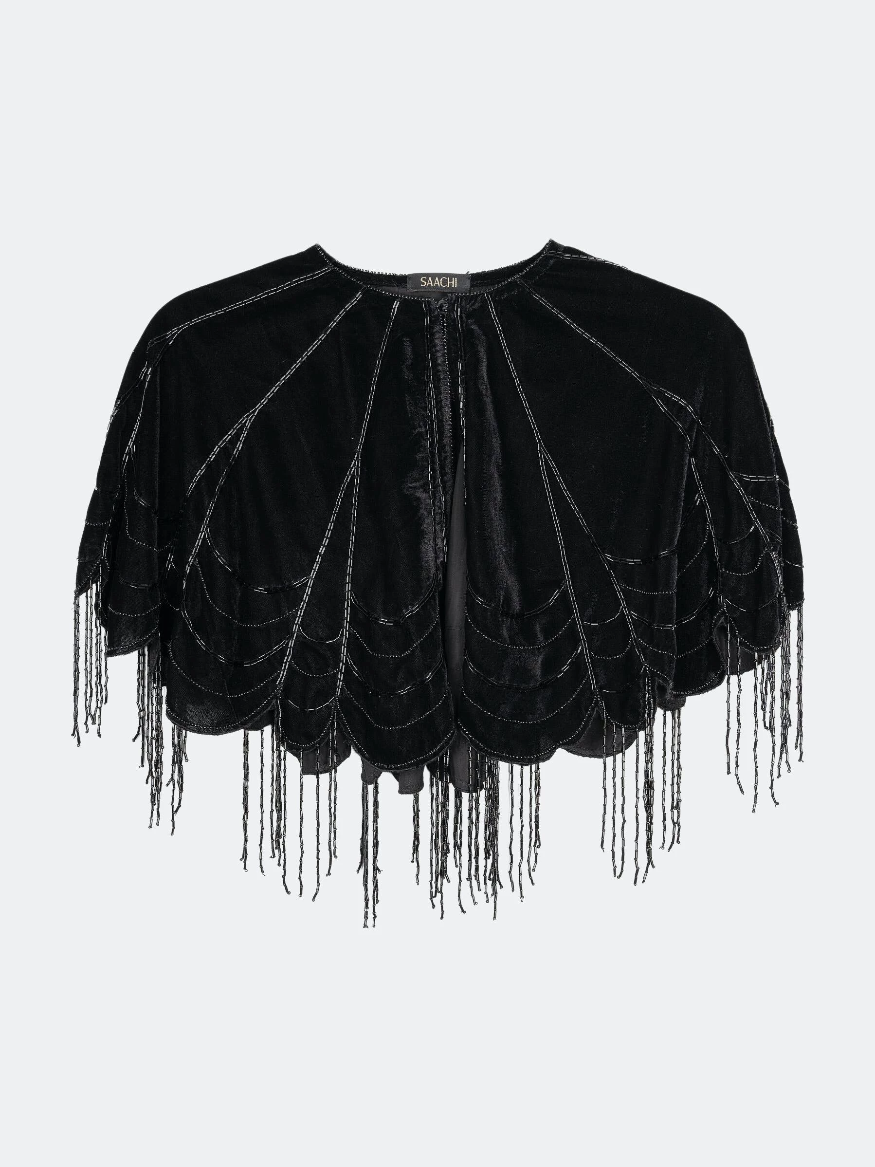 This Scallops embellished velvet capelet is a must-have for this time of year; use it to dress up a casual appearance or finish a party look. And, this stunner is an exclusive mainstay that can be worn all year round. It features intricate work accomplished with the aid of dainty embellishments. In addition, it has a zip-up front, making it seem a little more sophisticated to drape.