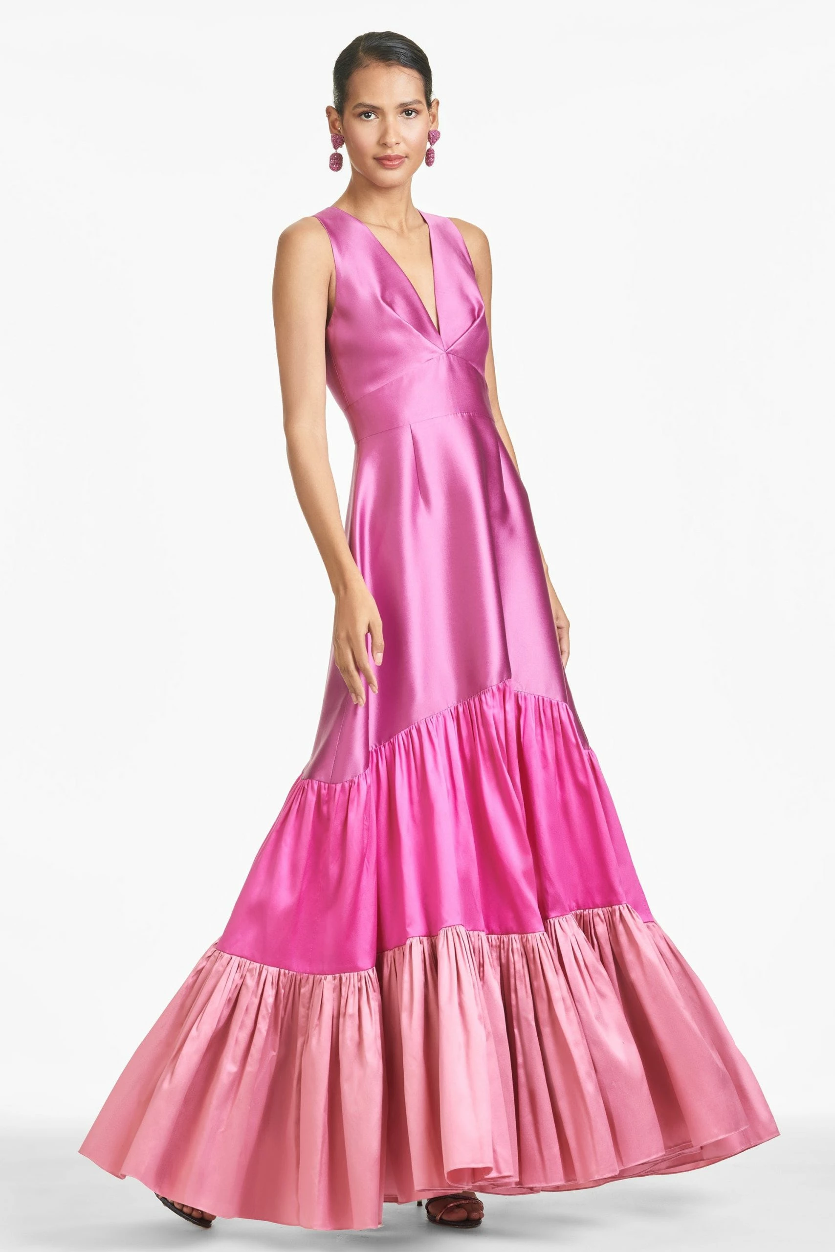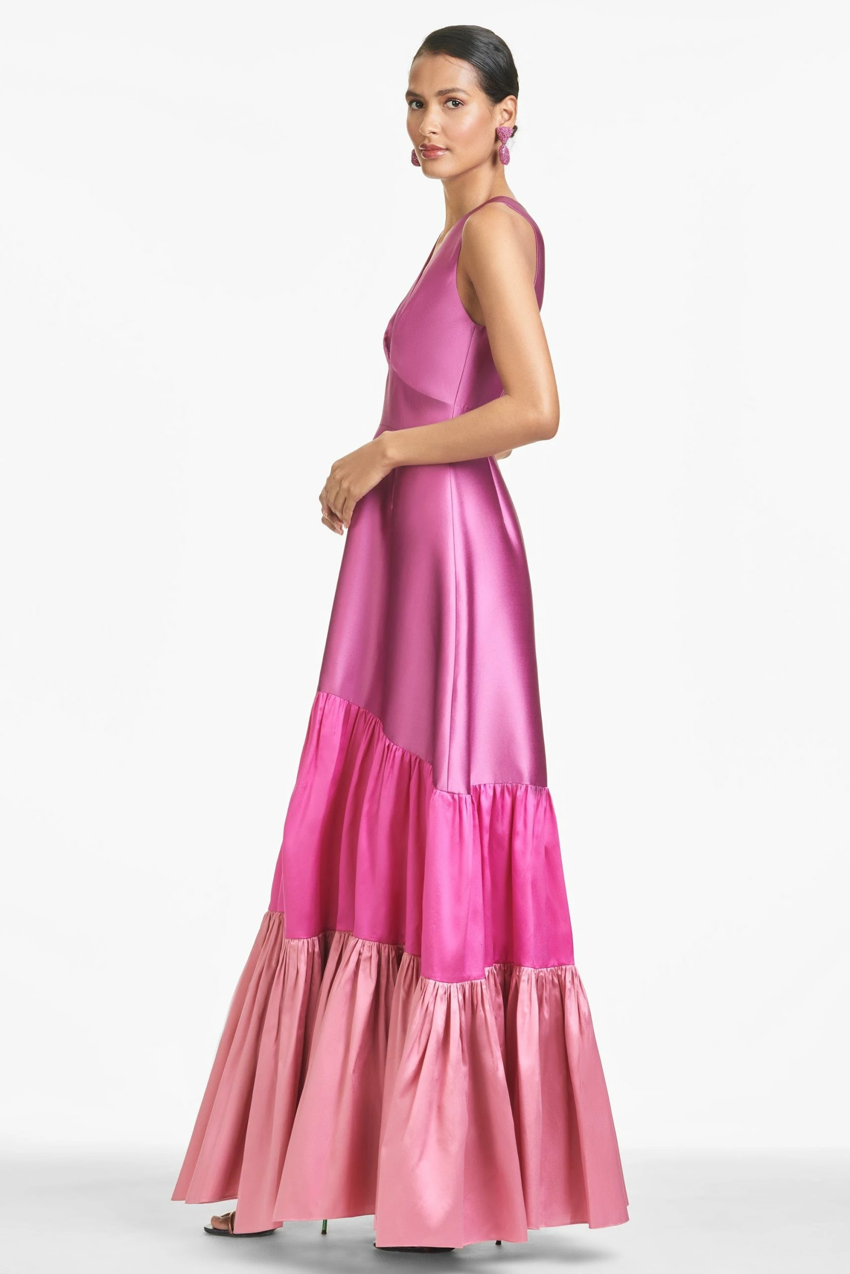 Rori is not for those looking to blend, she is a showstopping conversation piece. A clean a-line silhouette with deep v-neckline is punctuated through tiers of color. At the top, a flattering Fuchsia shade that lights the skin, followed by a brighter shade and finished with a deep pink.