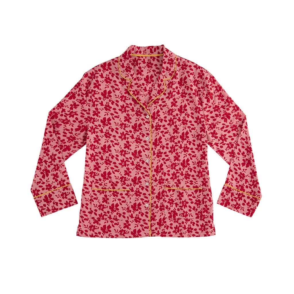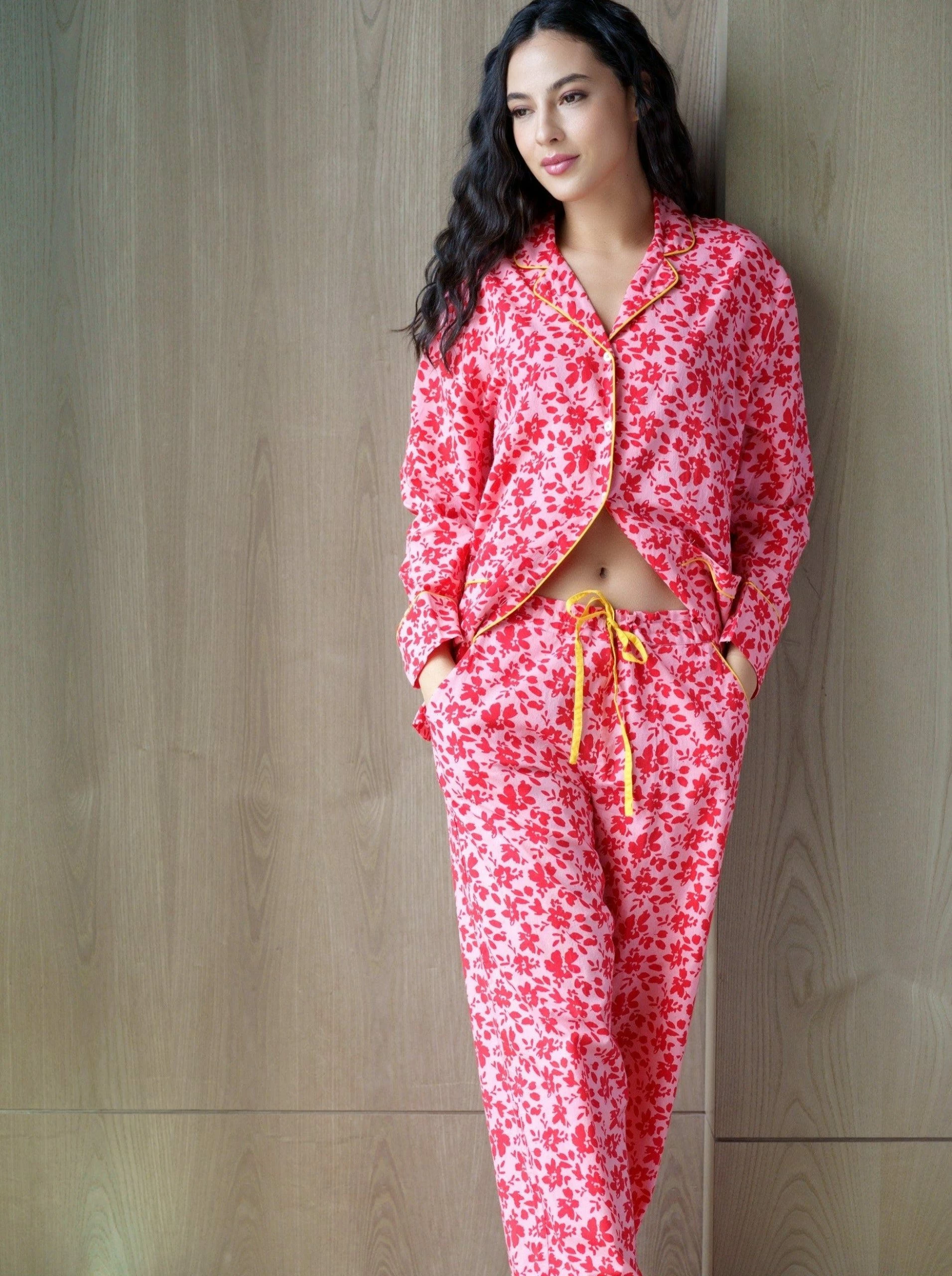 Nothing is better than slipping into Shiraleah’s Noelle PJ set before a blissful night’s sleep. This set features a bright red floral print upon a pink background with yellow detailing along with lapel, waistline, pockets, and hem giving this set an extra pop of color. The color and print combination makes this sassy set perfect for the holidays or every night sleep. Pair with other items from the Shiraleah collection to complete your look.