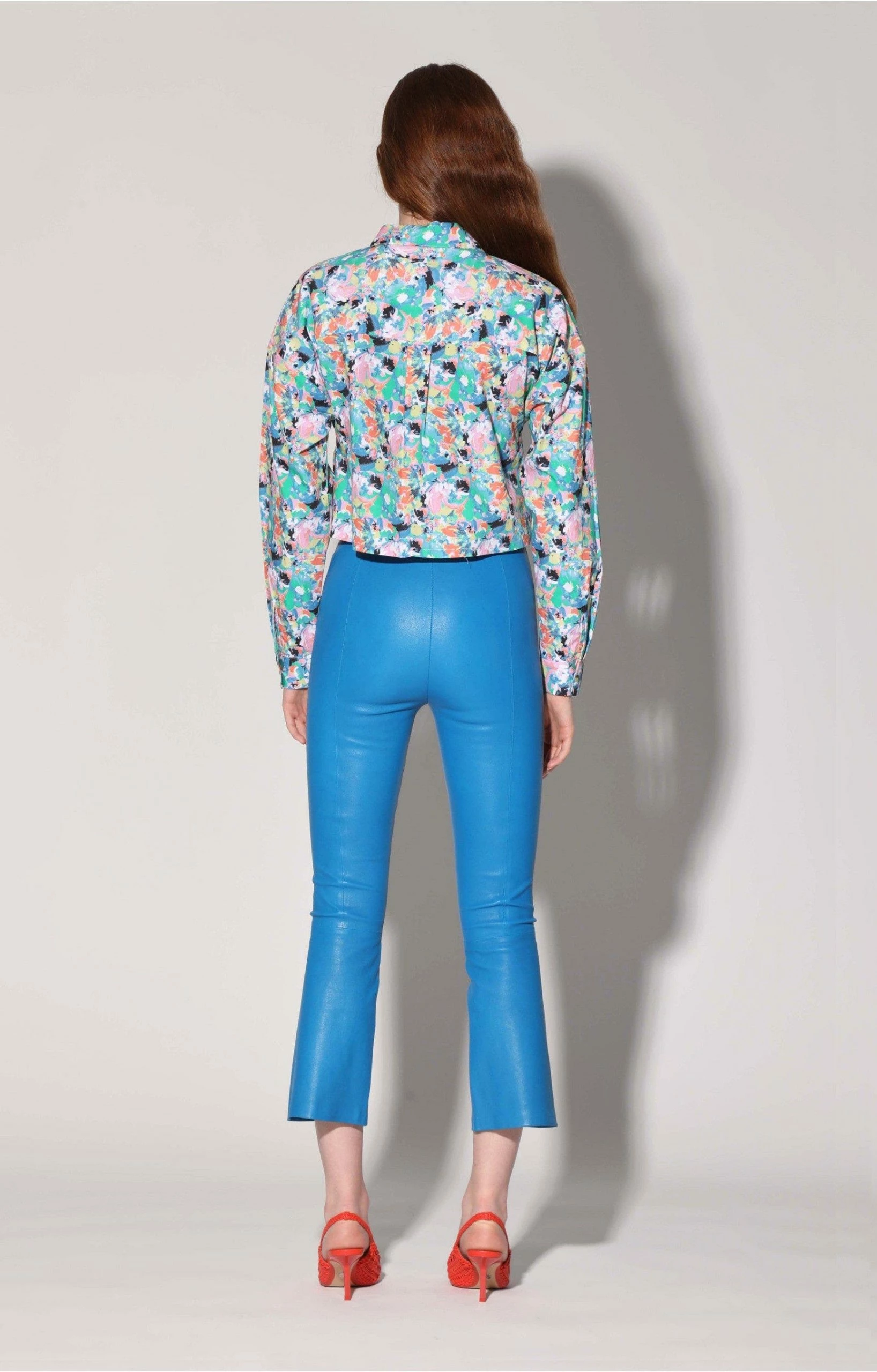 A pull on pant with crop flair detail, you’ll want the Lori Pants in every color!Mid-rise waist; Pull on; Cropped, flare leg100% stretch leatherProfessional clean only